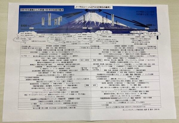 この年表では人口構造、社会構造、経済構造、金融構造、経営構造、企業構造、人事構造、価値構造、利益構造、産業構造、時代構造、マーケティングの有り方、ファイナンスの有り方、リスクの有り方、リーダーシップの有り方、目的の立て方、善の基準などを、2000年を軸(1950年~2050年)としてポイントを列挙しています。